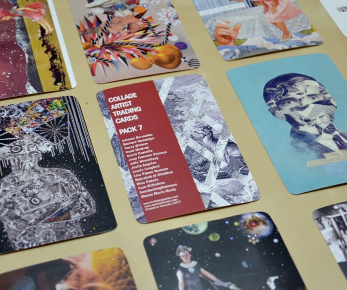 Collage Artist Trading Card packs are a tool for discovering contemporary, fine art collage. Each card is a full colour, 5.5” x 3.5” postcard with rounded corners. An example of an artist’s work is on the front of the card and the artist’s public contact information is on the back. Collage Artist Trading Cards come in packs of 15.